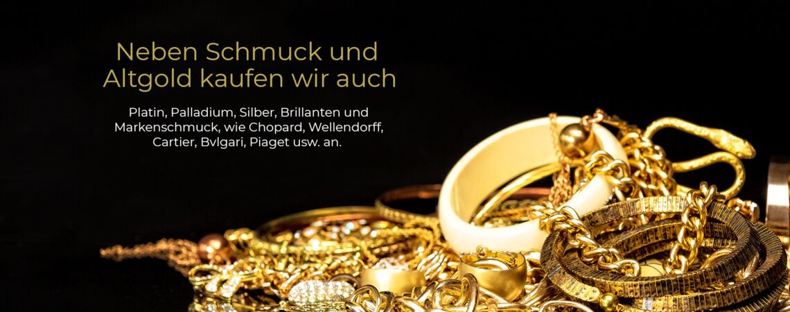 Neben Schmuck und Altgold kaufen wir auch Platin, Palladium, Silber, Münzen, Schmuck, Antikschmuck, silber- und goldfarbenes Zahngold, Brillanten, hochwertige Uhren und Markenschmuck, wie Chopard, Wellendorff, Cartier, Bvlgari, Piaget, Jörg Heinz, Lapponia und weitere an.